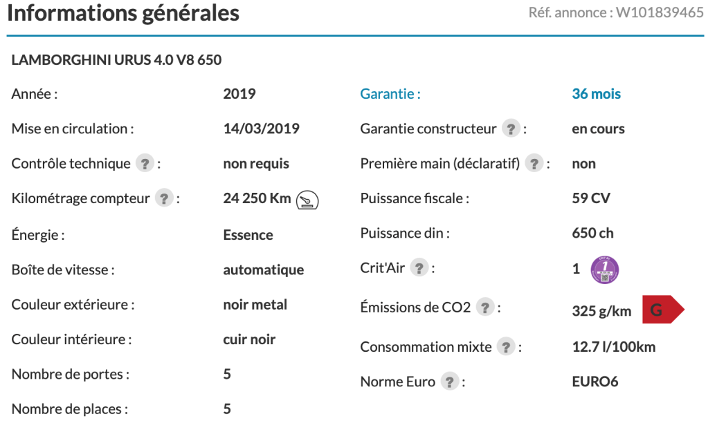 Lamborghini URUS. Comptabilisant 15 435 kilomètres. Le prix est de 259 000 euros.